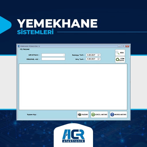 - Yazılımda raporlama sistemi sayesinde hangi departman da, cihazda, hangi günde kaç personelin ne kadar yemek yediğini vb. şekilde raporlamalar sağlanmaktadır. Bu raporları Word, Excel , Pdf formatında kaydedilebilir veya yazıcıdan direk çıktı alınabilmektedir.